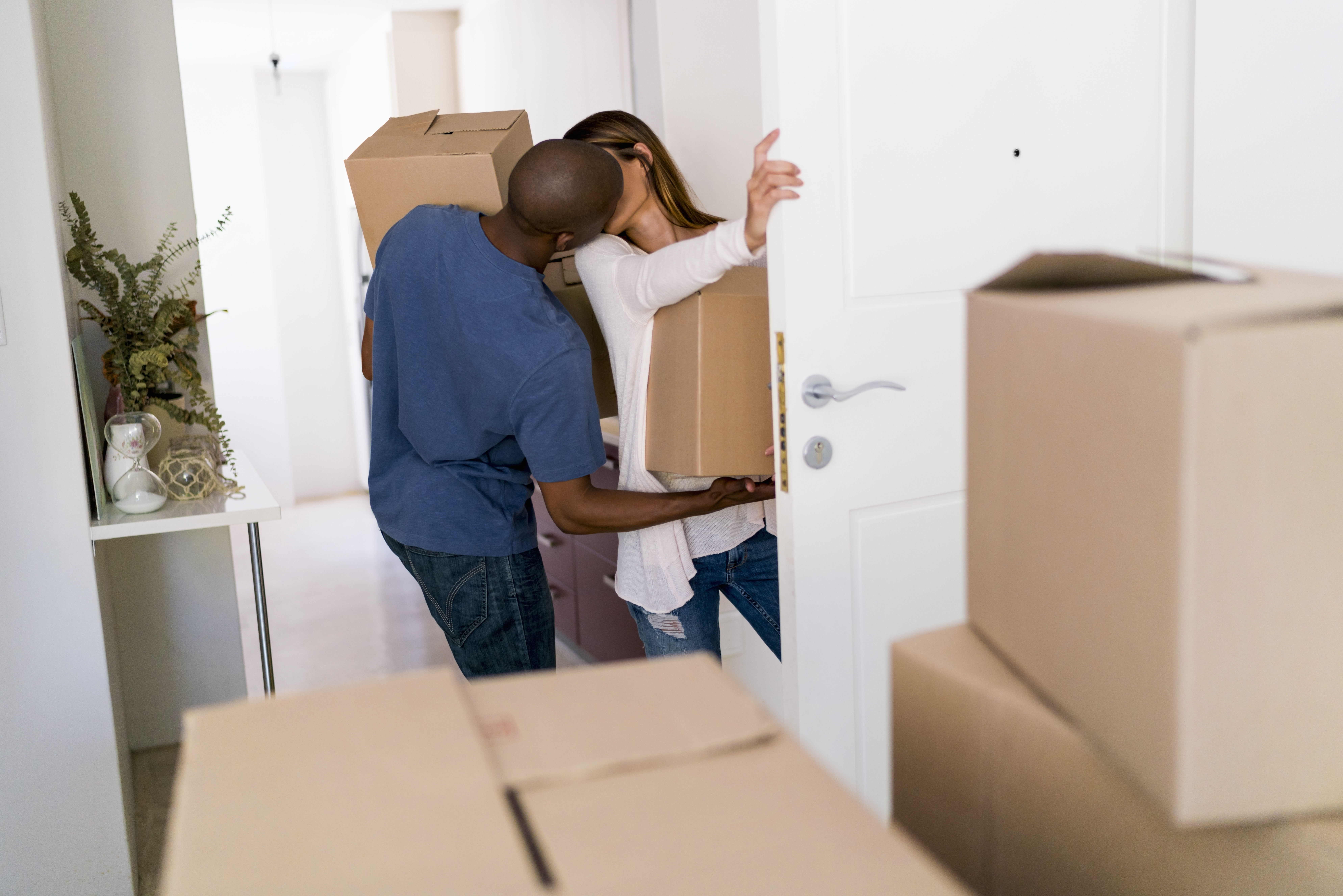 Couple kissing while moving into new house