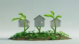 make 3 houses look like plants that are just starting to bud into houses from teh ground